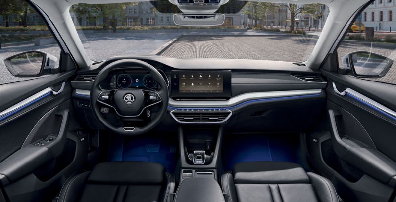 Vítáme vás v interiéru nové generace, který posouvá měřítka ve své třídě. Head-up displej promítající informace na čelní sklo vám nabídne nový pohled na svět. Vše důležité potom najdete na dvou 10" displejích. Minimalistické linie a ambientní osvětlení dotváří elegantní atmosféru na palubě.