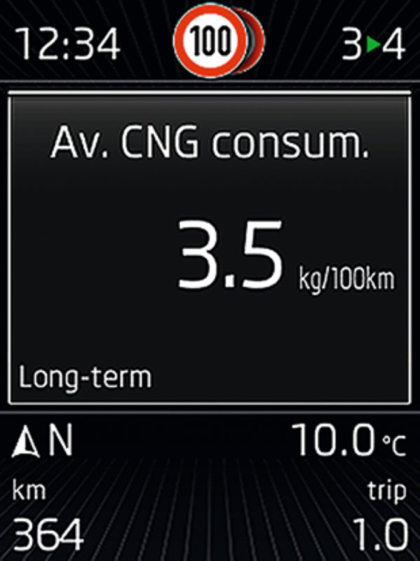 Dojezd nového vozu Octavia G-TEC je působivý: Při provozu čistě na CNG ujede vůz až 430 km na jedno natankování. Spotřeba činí 5,3 m3 (3,4 kg) zemního plynu na 100 km, to odpovídá emisím CO2 ve výši pouhých 94 g/km. Při provozu na benzin činí dojezd 940 km. Octavia G-TEC tak na jedno natankování do Bi-fuel nádrže ujede celkem až 1.370 km. Objem nádrží – benzin (50 l), 2 nádrže na CNG (15 kg). Přepínání mezi nádržemi je automatické vč. zobrazení stavu nádrže na palubní desce.